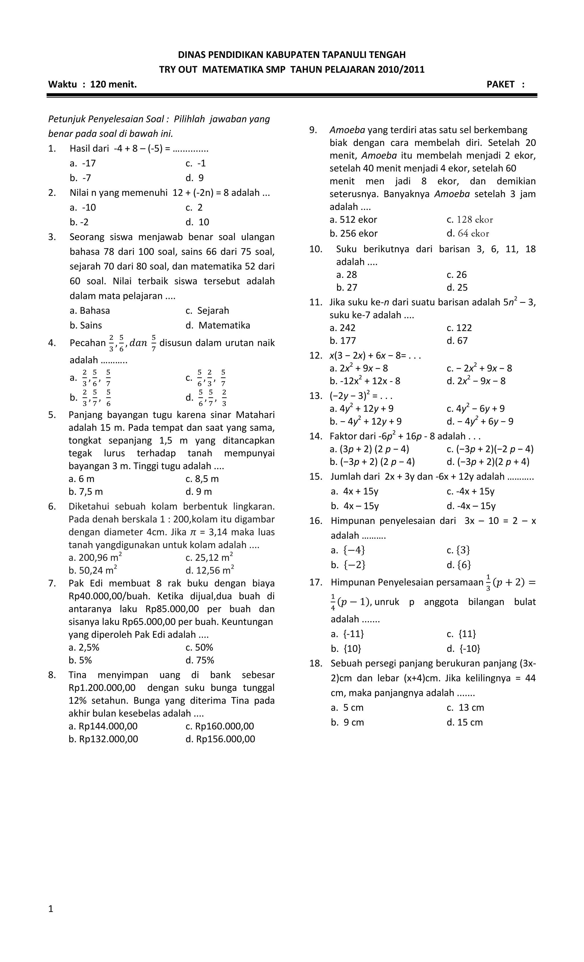 Dokumen tersebut berisi soal-soal ujian matematika SMP dan petunjuk penyelesaiannya. Soal-soal tersebut meliputi materi seperti operasi hitung, pecahan, persamaan, dan geometri. Terdapat 40 soal yang harus diselesaikan peserta ujian dalam waktu 120 menit.