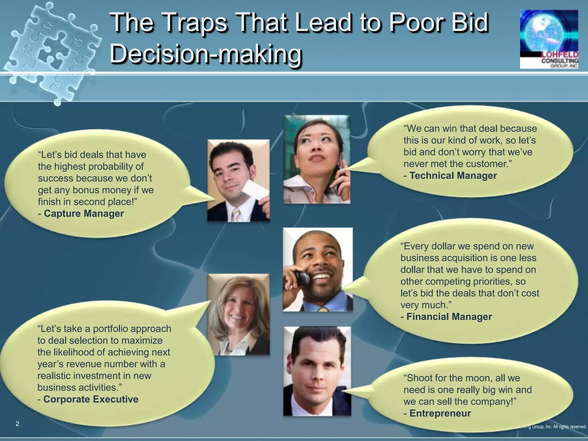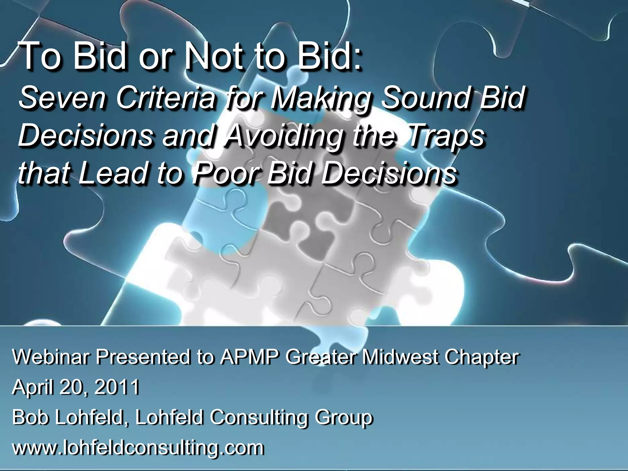 This document summarizes a webinar on making sound bid decisions and avoiding poor decisions that can lead to losing bids. It outlines seven criteria for qualifying deals, including strategic fit, solutions, customer advocacy, finances, and costs. It also discusses improving win probability through understanding customer needs, having the right solution, teaming partners, and personnel. Finally, it emphasizes making early bid decisions, focusing pursuit efforts, and reaffirming decisions to increase the likelihood of winning bids.