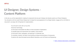 The document outlines the role of a UI designer in developing a design system that enhances product design and implementation across teams. It emphasizes the importance of maintaining consistency, usability, and accessibility in the design process while collaborating with various disciplines. The design system serves as a foundational source of truth that aids scalability and includes guidelines for components, styles, and best practices.