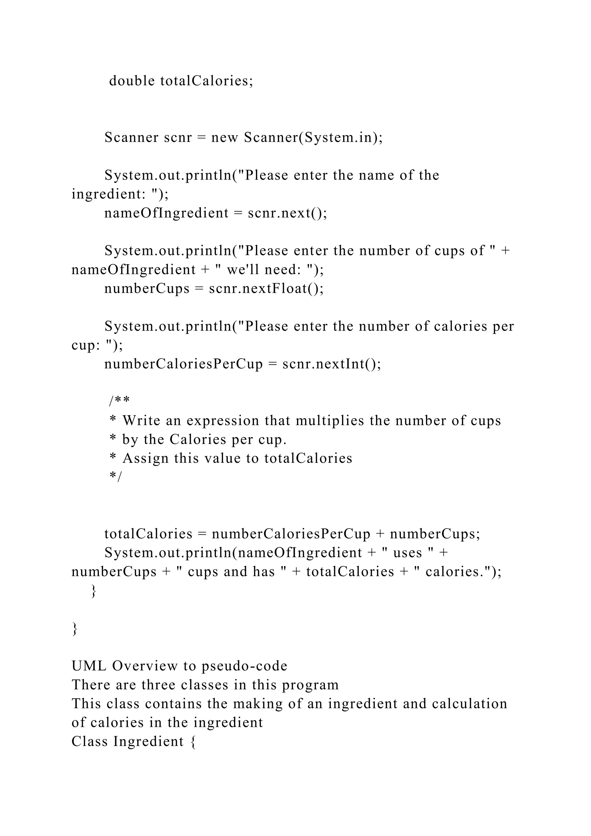 The document outlines a Java program for an ingredient calculator and recipe manager, detailing the main class and supporting classes such as Ingredient, Recipe, and RecipeBox. It includes methods for getting and setting ingredient properties, calculating total calories, and managing recipes. Additionally, it specifies guidelines for improving data validation and error handling in user inputs.