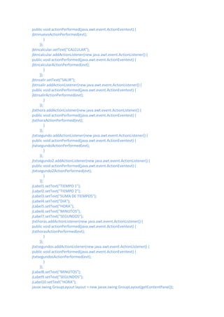 This document contains the code for a Java GUI application that allows a user to enter two times and calculates the sum of the times. It defines the layout of the GUI with labels and text fields for the hours, minutes, seconds of two times as well as labels and fields to display the sum. It also defines buttons to calculate the sum, start a new time entry, and exit the application. The code sets up the event handlers for the buttons and text fields.