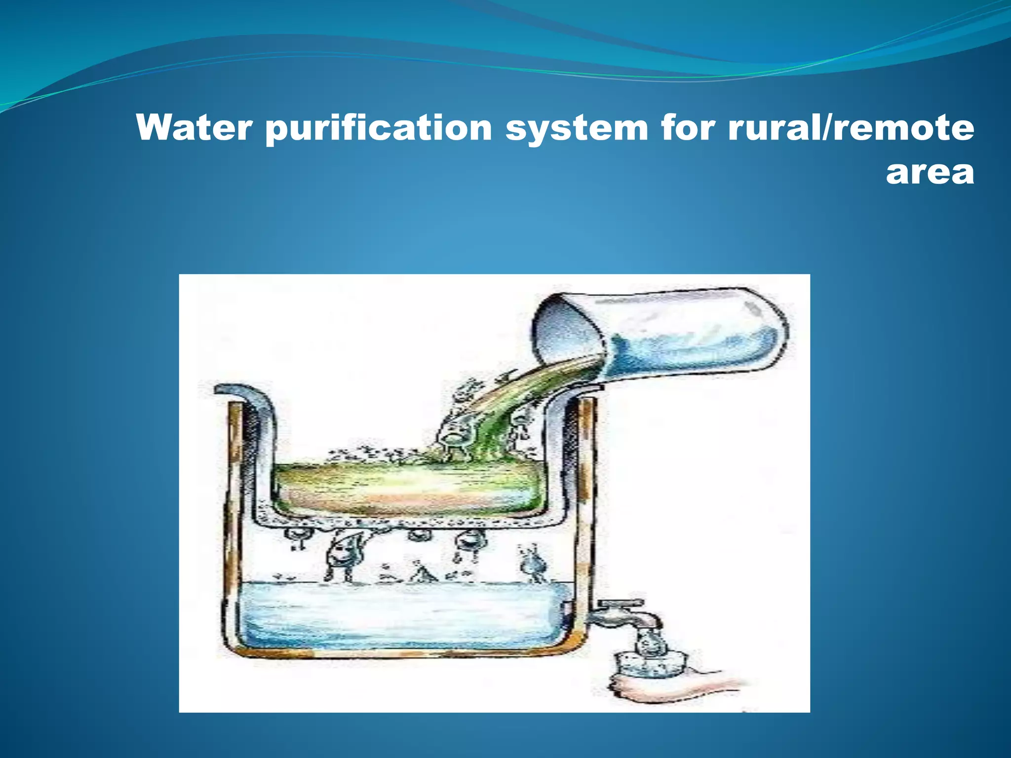 This document describes a proposed water purification system for rural/remote areas that uses natural materials. It involves collecting contaminated water and passing it through two treatment stages. The primary treatment uses large and medium sand stones, charcoal, neem leaves, rice husk, and papaya seeds to remove solids and bacteria. The secondary treatment uses moringa seeds powder, tulsi leaves, and sugarcane baggage to remove additional bacteria, viruses, heavy metals, and provide further purification. Experiments showed moringa seeds were able to remove over 90% of water turbidity. The system aims to provide clean drinking water at low cost using locally available and renewable materials.