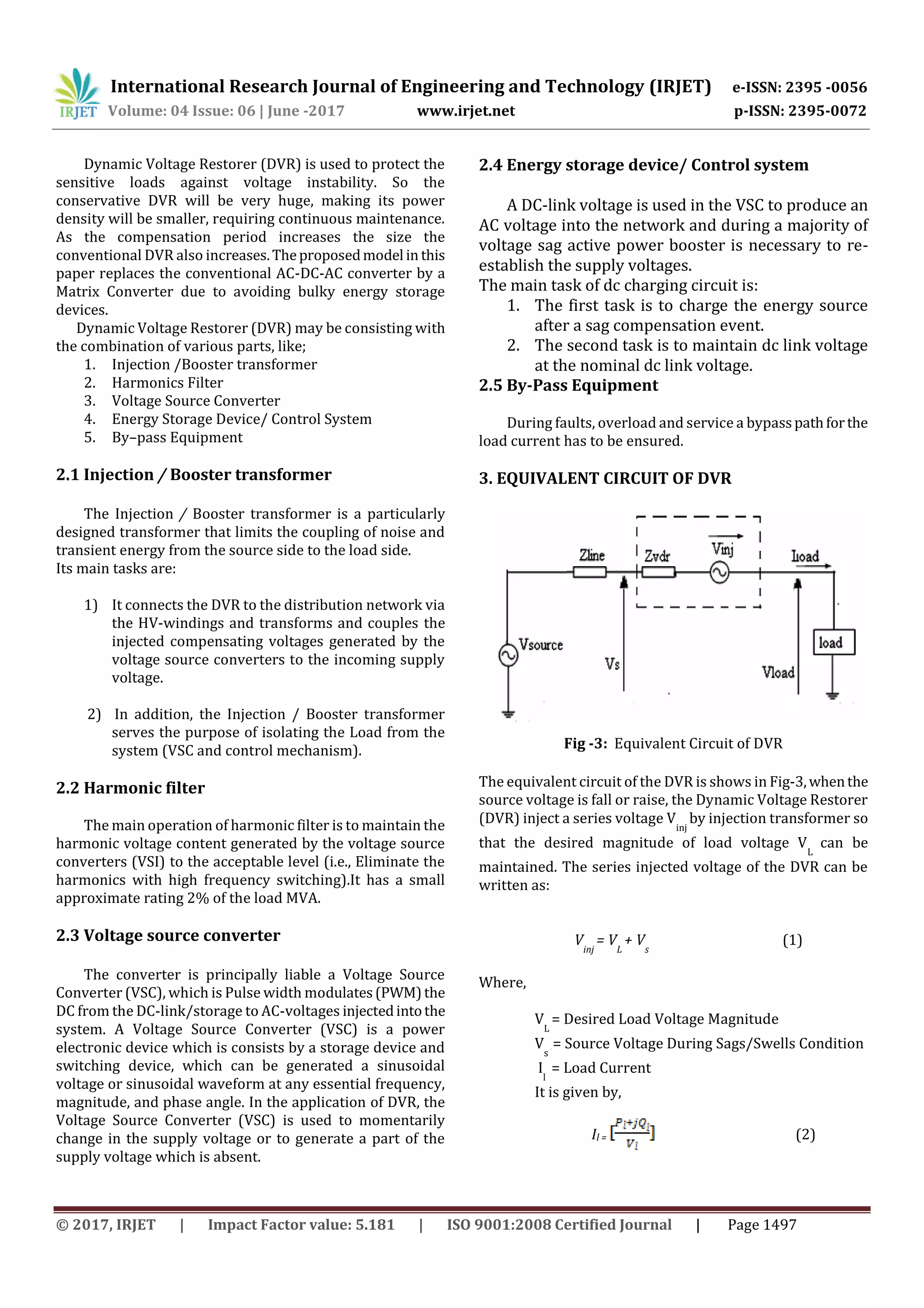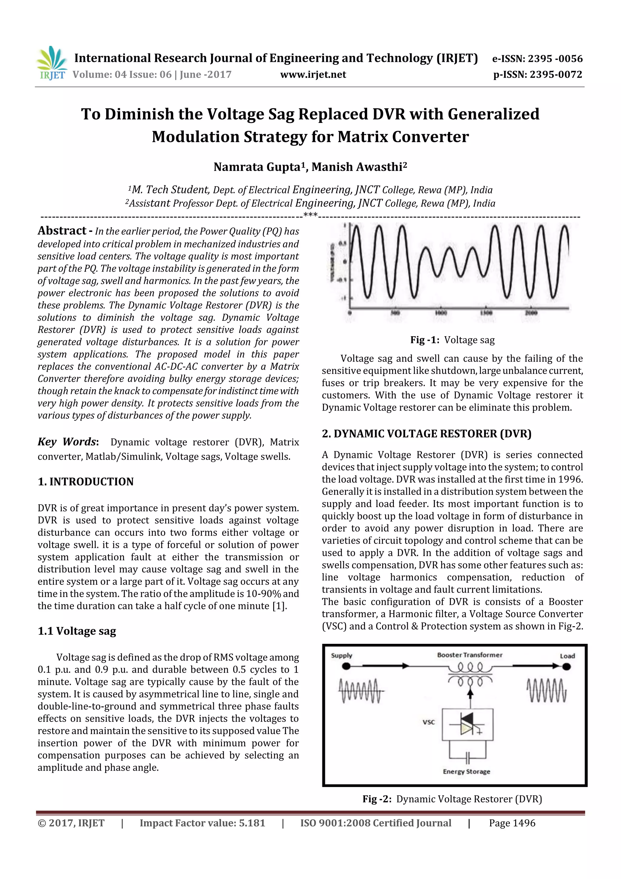 This document discusses replacing a conventional Dynamic Voltage Restorer (DVR) with a matrix converter to compensate for voltage sags. A DVR injects voltage to maintain the load voltage during disturbances. Conventional DVRs use bulky AC-DC-AC converters. The proposed model replaces this with a matrix converter to avoid energy storage and allow for higher power density. A matrix converter directly converts AC to AC using bi-directional switches. It can compensate for voltage sags and swells more efficiently than a conventional DVR without energy storage limitations. Simulation results show the DVR with matrix converter effectively regulates voltage during faults.