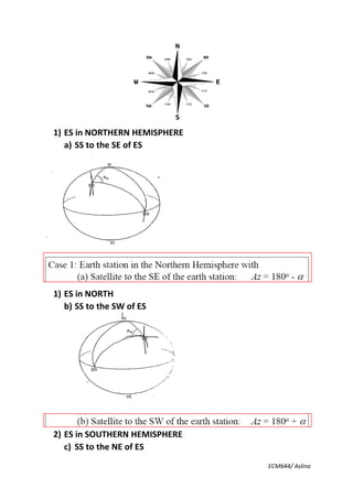 This document provides steps to calculate the look angle for observing a geostationary or GEO satellite. It outlines calculating the central angle, elevation angle, and intermediate angle. A GEO satellite is visible if the central angle is less than or equal to 81.3 degrees. It also lists the different azimuth angles needed depending on whether the observer is in the northern or southern hemisphere and the position of the satellite relative to the observer's east or west.