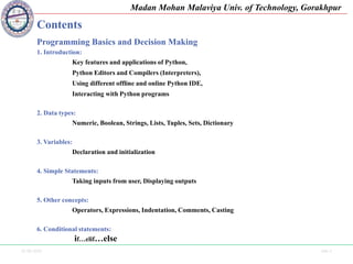 The document provides an overview of Python programming basics, including key features, data types, variables, simple statements, and conditional statements. It covers Python's applications in web development, data science, and more, highlighting its advantages like readability and a vast collection of libraries. Additionally, it discusses various Python editors and interpreters, making it suitable for both beginners and experienced programmers.