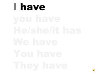 This document provides examples of conjugating the verb "to have" in simple present and simple past tense in the first person singular and plural, second person singular and plural, and third person singular and plural. It encourages the reader to practice conjugating the verb aloud for each subject pronoun. It notes that "to have" is not a difficult verb to conjugate as it only has four forms: have, has, had, and having. It emphasizes the importance of drilling the conjugations until they are mastered.