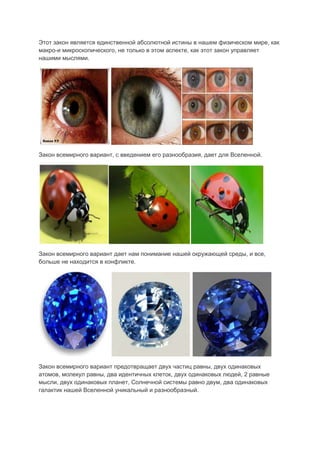 Закон всемирного варианта объясняет уникальность всех объектов и событий во вселенной, утверждая, что не существует двух одинаковых моментов или вещей. Он представляет собой основополагающее правило, управляющее как физическим, так и сущностным аспектами нашей жизни и мышления. Закон утверждает, что разнообразие является константой вселенной и что только математика может быть точной наукой.