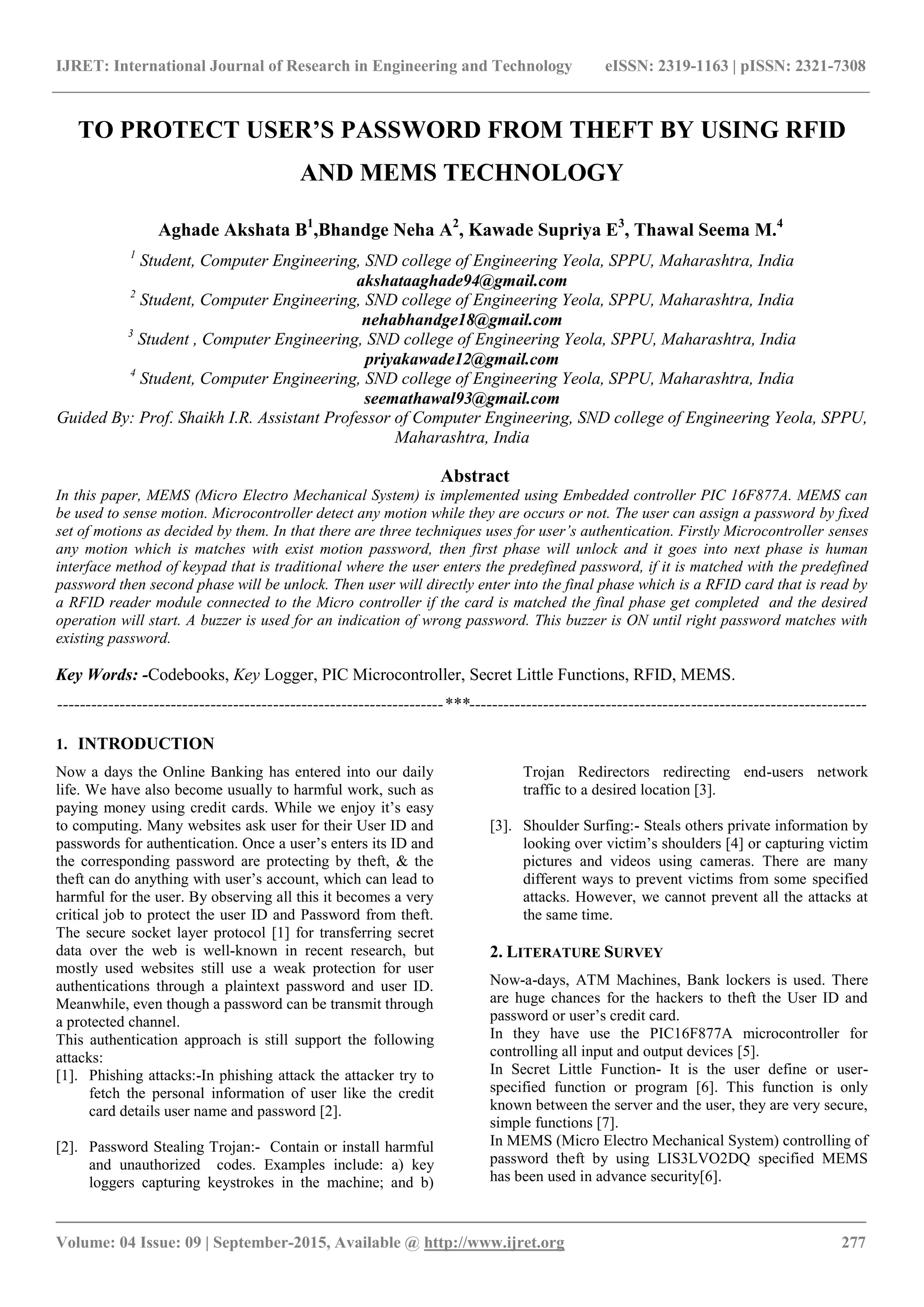 The paper proposes a security system that protects user passwords from theft using RFID and MEMS technology. It includes three authentication phases: motion sensing with MEMS, traditional password entry through a keypad, and RFID card verification. The proposed mechanism aims to mitigate various attacks such as phishing, keylogging, and shoulder surfing.
