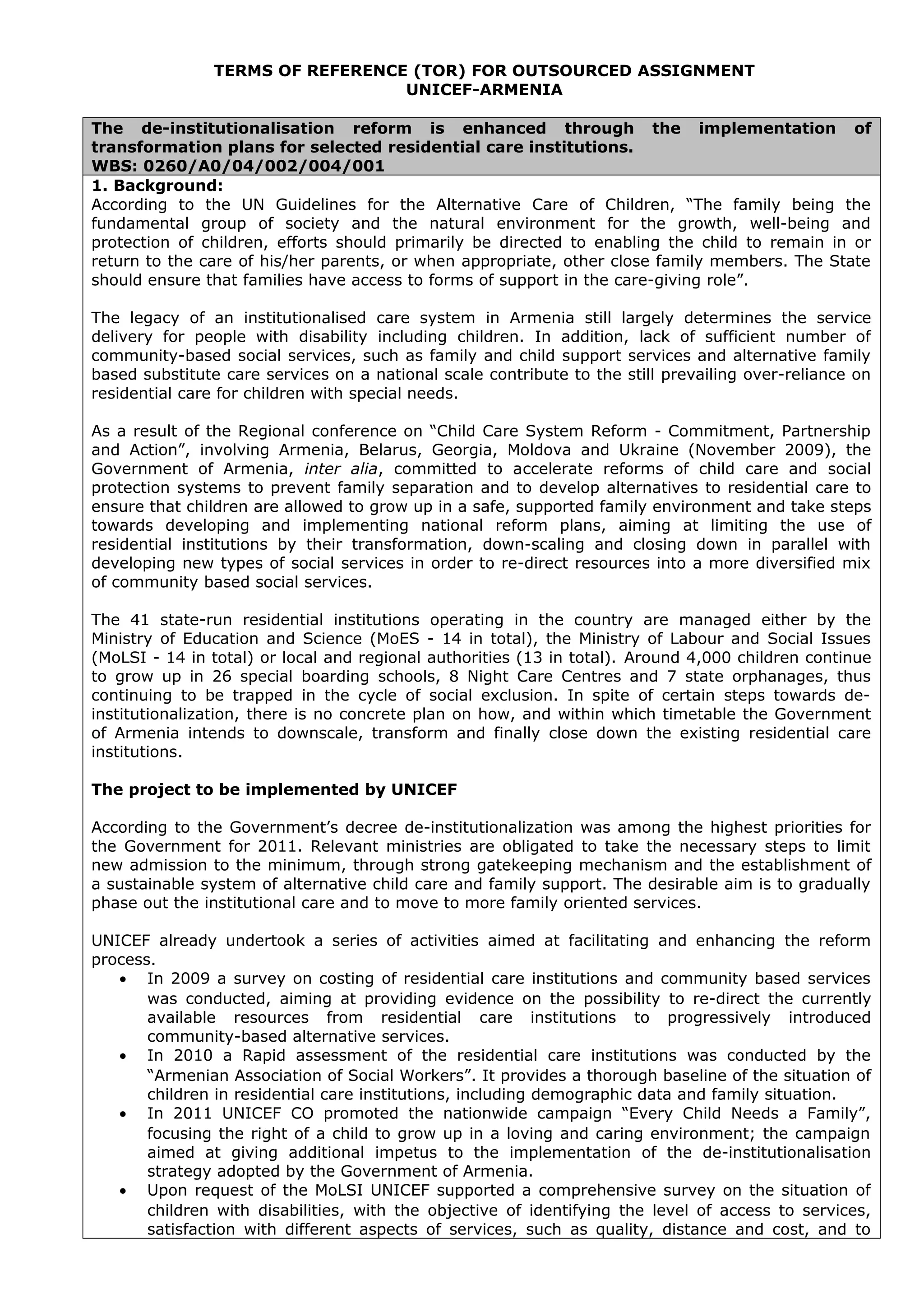 TERMS OF REFERENCE(TOR) FOR OUTSOURCED ASSIGNMENT UNICEF-ARMENIA The de-institutionalisation reform is enhanced through the implementation of transformation plans for selected residential care institutions. WBS: 0260/A0/04/002/004/001 1. Background: According to the UN Guidelines for the Alternative Care of Children, “The family being the fundamental group of society and the natural environment for the growth, well-being and protection of children, efforts should primarily be directed to enabling the child to remain in or return to the care of his/her parents, or when appropriate, other close family members. The State should ensure that families have access to forms of support in the care-giving role”. The legacy of an institutionalised care system in Armenia still largely determines the service delivery for people with disability including children. In addition, lack of sufficient number of community-based social services, such as family and child support services and alternative family based substitute care services on a national scale contribute to the still prevailing over-reliance on residential care for children with special needs. As a result of the Regional conference on “Child Care System Reform - Commitment, Partnership and Action”, involving Armenia, Belarus, Georgia, Moldova and Ukraine (November 2009), the Government of Armenia, inter alia, committed to accelerate reforms of child care and social protection systems to prevent family separation and to develop alternatives to residential care to ensure that children are allowed to grow up in a safe, supported family environment and take steps towards developing and implementing national reform plans, aiming at limiting the use of residential institutions by their transformation, down-scaling and closing down in parallel with developing new types of social services in order to re-direct resources into a more diversified mix of community based social services. The 41 state-run residential institutions operating in the country are managed either by the Ministry of Education and Science (MoES - 14 in total), the Ministry of Labour and Social Issues (MoLSI - 14 in total) or local and regional authorities (13 in total). Around 4,000 children continue to grow up in 26 special boarding schools, 8 Night Care Centres and 7 state orphanages, thus continuing to be trapped in the cycle of social exclusion. In spite of certain steps towards de- institutionalization, there is no concrete plan on how, and within which timetable the Government of Armenia intends to downscale, transform and finally close down the existing residential care institutions. The project to be implemented by UNICEF According to the Government’s decree de-institutionalization was among the highest priorities for the Government for 2011. Relevant ministries are obligated to take the necessary steps to limit new admission to the minimum, through strong gatekeeping mechanism and the establishment of a sustainable system of alternative child care and family support. The desirable aim is to gradually phase out the institutional care and to move to more family oriented services. UNICEF already undertook a series of activities aimed at facilitating and enhancing the reform process. • In 2009 a survey on costing of residential care institutions and community based services was conducted, aiming at providing evidence on the possibility to re-direct the currently available resources from residential care institutions to progressively introduced community-based alternative services. • In 2010 a Rapid assessment of the residential care institutions was conducted by the “Armenian Association of Social Workers”. It provides a thorough baseline of the situation of children in residential care institutions, including demographic data and family situation. • In 2011 UNICEF CO promoted the nationwide campaign “Every Child Needs a Family”, focusing the right of a child to grow up in a loving and caring environment; the campaign aimed at giving additional impetus to the implementation of the de-institutionalisation strategy adopted by the Government of Armenia. • Upon request of the MoLSI UNICEF supported a comprehensive survey on the situation of children with disabilities, with the objective of identifying the level of access to services, satisfaction with different aspects of services, such as quality, distance and cost, and to
