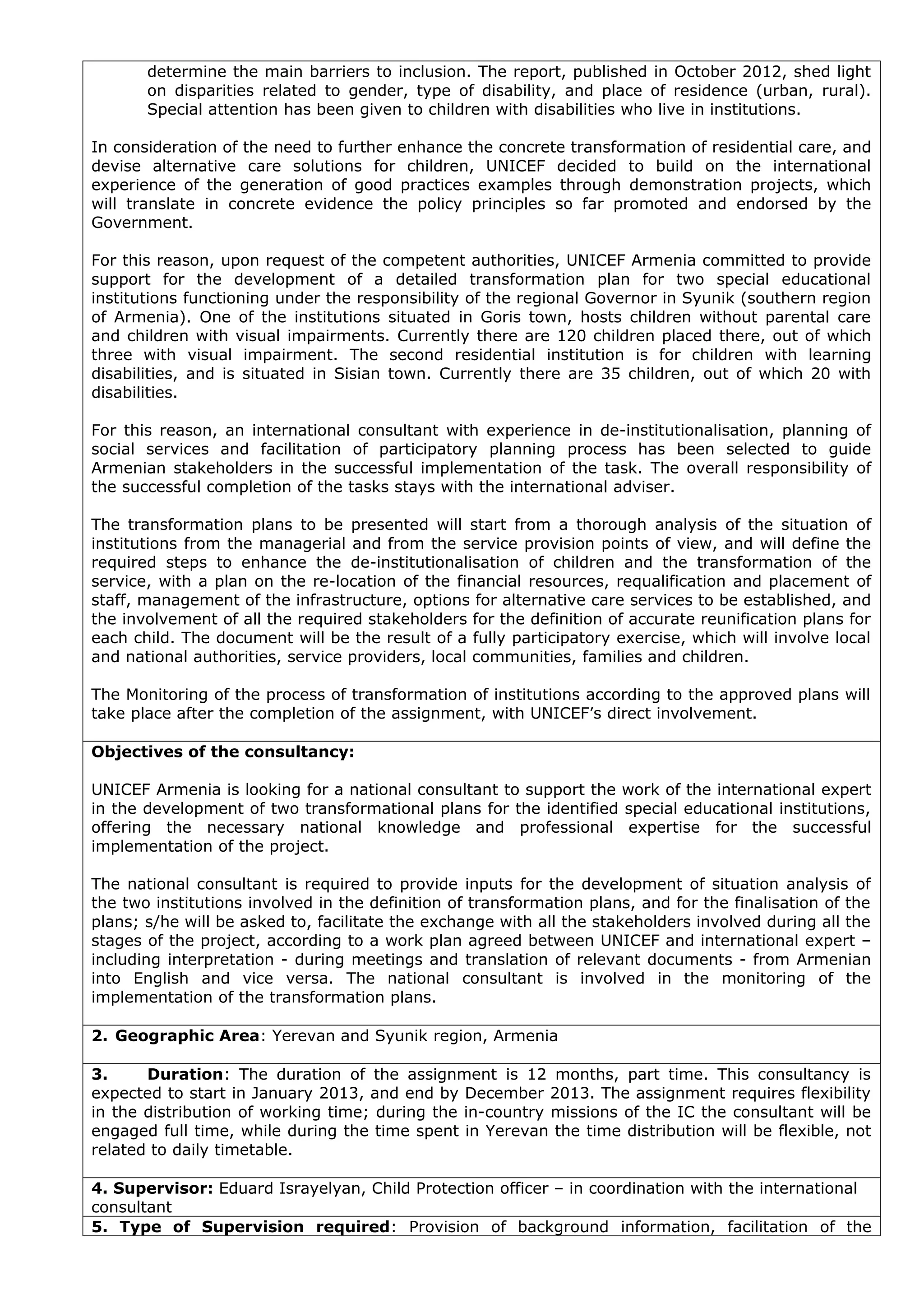 determine the mainbarriers to inclusion. The report, published in October 2012, shed light on disparities related to gender, type of disability, and place of residence (urban, rural). Special attention has been given to children with disabilities who live in institutions. In consideration of the need to further enhance the concrete transformation of residential care, and devise alternative care solutions for children, UNICEF decided to build on the international experience of the generation of good practices examples through demonstration projects, which will translate in concrete evidence the policy principles so far promoted and endorsed by the Government. For this reason, upon request of the competent authorities, UNICEF Armenia committed to provide support for the development of a detailed transformation plan for two special educational institutions functioning under the responsibility of the regional Governor in Syunik (southern region of Armenia). One of the institutions situated in Goris town, hosts children without parental care and children with visual impairments. Currently there are 120 children placed there, out of which three with visual impairment. The second residential institution is for children with learning disabilities, and is situated in Sisian town. Currently there are 35 children, out of which 20 with disabilities. For this reason, an international consultant with experience in de-institutionalisation, planning of social services and facilitation of participatory planning process has been selected to guide Armenian stakeholders in the successful implementation of the task. The overall responsibility of the successful completion of the tasks stays with the international adviser. The transformation plans to be presented will start from a thorough analysis of the situation of institutions from the managerial and from the service provision points of view, and will define the required steps to enhance the de-institutionalisation of children and the transformation of the service, with a plan on the re-location of the financial resources, requalification and placement of staff, management of the infrastructure, options for alternative care services to be established, and the involvement of all the required stakeholders for the definition of accurate reunification plans for each child. The document will be the result of a fully participatory exercise, which will involve local and national authorities, service providers, local communities, families and children. The Monitoring of the process of transformation of institutions according to the approved plans will take place after the completion of the assignment, with UNICEF’s direct involvement. Objectives of the consultancy: UNICEF Armenia is looking for a national consultant to support the work of the international expert in the development of two transformational plans for the identified special educational institutions, offering the necessary national knowledge and professional expertise for the successful implementation of the project. The national consultant is required to provide inputs for the development of situation analysis of the two institutions involved in the definition of transformation plans, and for the finalisation of the plans; s/he will be asked to, facilitate the exchange with all the stakeholders involved during all the stages of the project, according to a work plan agreed between UNICEF and international expert – including interpretation - during meetings and translation of relevant documents - from Armenian into English and vice versa. The national consultant is involved in the monitoring of the implementation of the transformation plans. 2. Geographic Area: Yerevan and Syunik region, Armenia 3. Duration: The duration of the assignment is 12 months, part time. This consultancy is expected to start in January 2013, and end by December 2013. The assignment requires flexibility in the distribution of working time; during the in-country missions of the IC the consultant will be engaged full time, while during the time spent in Yerevan the time distribution will be flexible, not related to daily timetable. 4. Supervisor: Eduard Israyelyan, Child Protection officer – in coordination with the international consultant 5. Type of Supervision required: Provision of background information, facilitation of the