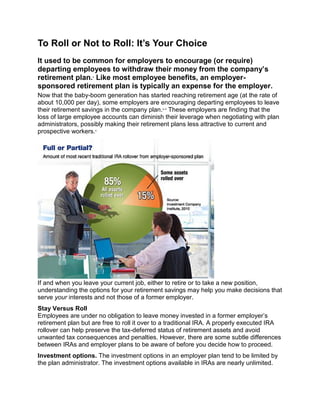 2) When leaving a job, employees have the option to roll over their retirement savings into a traditional IRA or leave it in the employer plan. Leaving it in the employer plan allows avoiding penalties for early withdrawals starting at age 55, while an IRA offers more investment options.