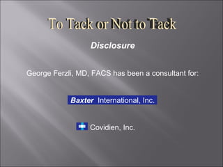 The document discusses the debate around whether mesh should be tacked or not during laparoscopic hernia repair surgery. It summarizes several studies that found: 1) There was no difference in hernia recurrence rates whether the mesh was tacked or not. 2) Patients who did not have their mesh tacked experienced less post-operative pain and required fewer pain medications. 3) Tacking the mesh increased the cost and time of the surgery without providing clinical benefits. Therefore, the document concludes that laparoscopic hernia repair can be performed safely without the routine use of mesh fixation devices.