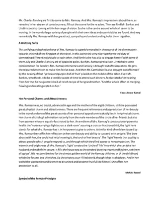 This document provides a detailed summary and analysis of Virginia Woolf's novel To the Lighthouse, with a focus on the central character of Mrs. Ramsay. The summary discusses Mrs. Ramsay's dominating presence in the novel, her unifying role that brings the other characters together, her kindness and sympathy towards others, and how she continues to influence the characters even after her death. The document analyzes Mrs. Ramsay as a symbol of the female principle and examines her various traits like her charm, grace, sense of humor, and role as a matchmaker trying to unite people.