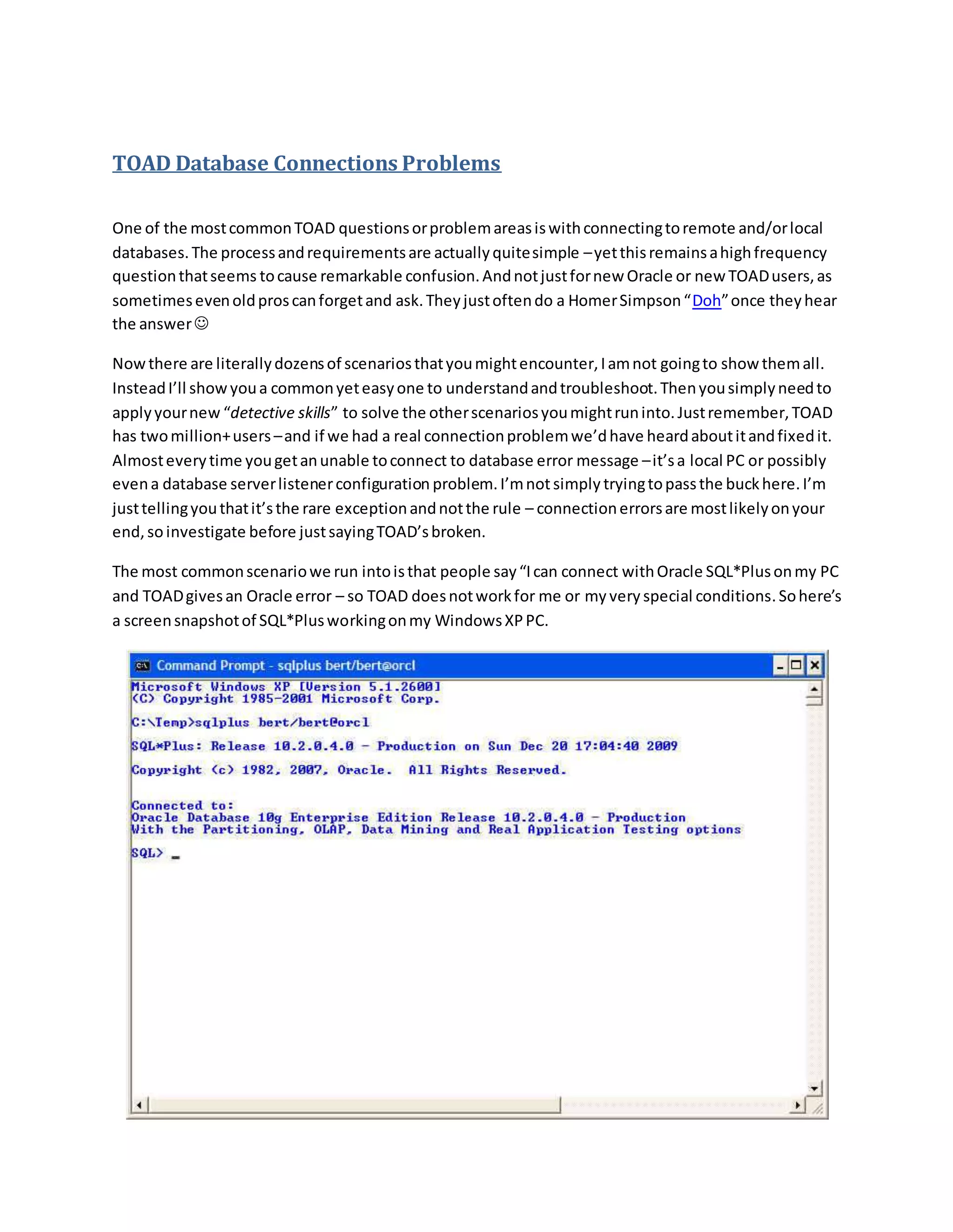 TOAD is commonly used to connect to databases but users often encounter connection errors. These errors are usually due to local configuration issues on the user's computer rather than problems with TOAD itself. One example shown is where a user's PATH environment variable points to an Oracle home that does not contain the necessary TNSNames.ora file, preventing TOAD from connecting. Adjusting the PATH to point to the correct Oracle home location resolved the issue. The key lesson is for users to investigate their local Windows and Oracle configuration when connection errors occur, as TOAD itself rarely has problems connecting to databases.