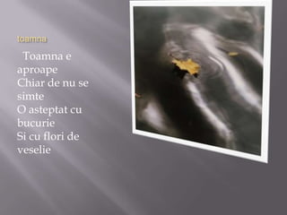 Documentul descrie frumusețea toamnei, când frunzele cad și se formează un covor pufos. Este o perioadă de recoltare, cu fructe delicioase și o atmosferă de bucurie, chiar dacă se simte venirea iernii. Toamna este prezentată ca un anotimp plin de daruri, dar în același timp indică sfârșitul verii și plecarea păsărilor.