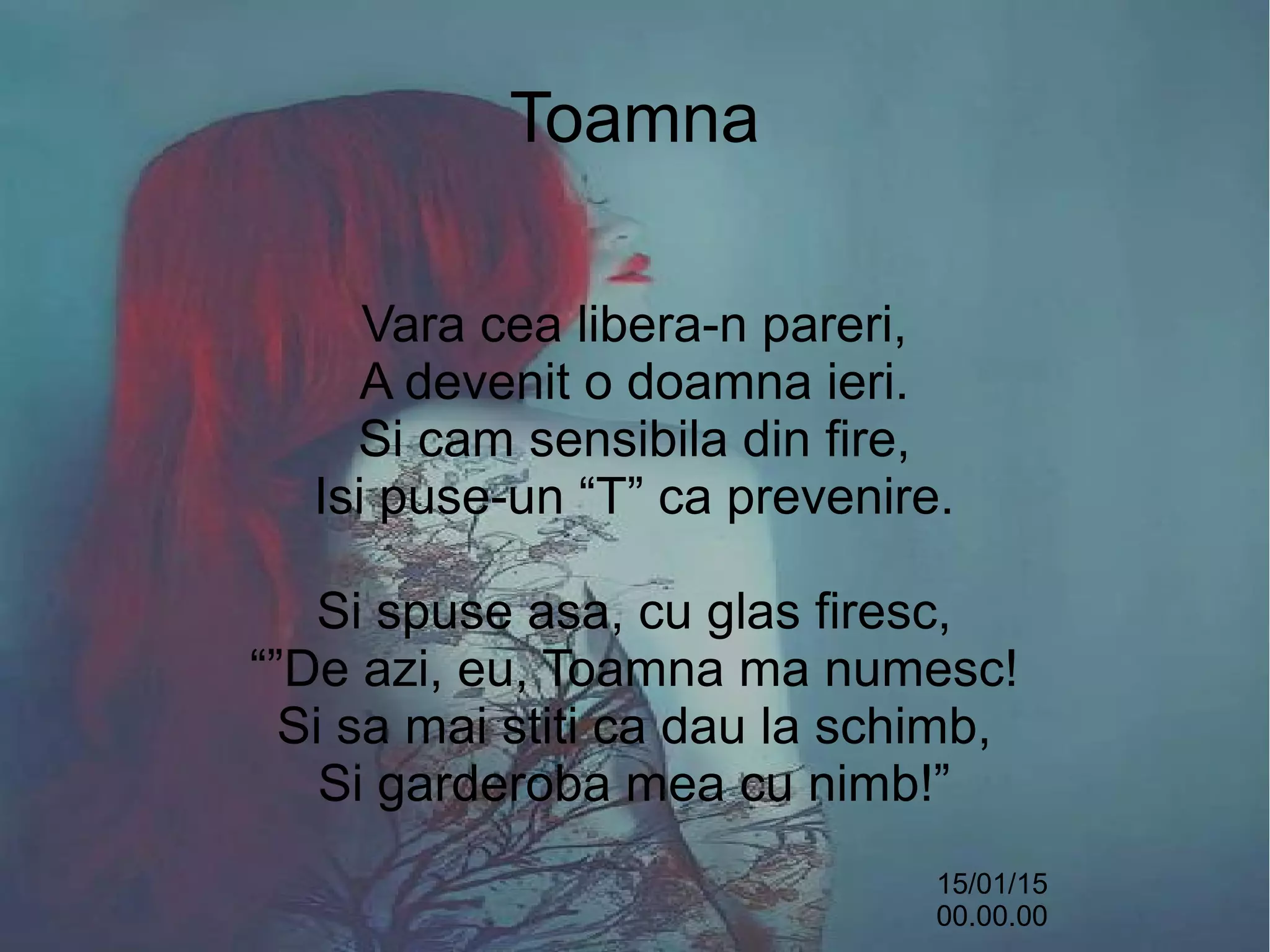 Documentul descrie o personificare a toamnei, care își schimbă garderoba și își exprimă sentimentul de melancolie față de vara care s-a încheiat. Toamna, înfrumusețată cu culori intense, își îmbrățișează frunzele uscate și le oferă o nouă viață prin colorare. Este o reflecție poetică asupra schimbării anotimpurilor și a frumuseții efemere a naturii.
