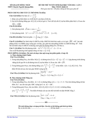 Đề thi thử tuyển sinh đại học năm 2012 môn Toán của Sở GD&ĐT Đồng Tháp gồm nhiều câu hỏi từ khảo sát hàm số, giải phương trình đến tính thể tích hình chóp. Thí sinh cần giải quyết các bài toán liên quan đến phương trình, bất phương trình và hình học trong không gian. Đề thi được chấm điểm tổng cộng 10 điểm, trong đó phần chung chiếm 7 điểm và phần riêng là 3 điểm.