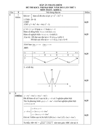 Đề thi tốt nghiệp THPT môn Toán năm 2011 bao gồm các câu hỏi về khảo sát hàm số, giải phương trình, tính tích phân và hình học không gian. Thí sinh cần hoàn thành phần chung và chọn một trong hai phần riêng theo chương trình chuẩn hoặc nâng cao. Đề thi yêu cầu sử dụng kiến thức tổng hợp để giải quyết các bài toán phức tạp liên quan đến toán học.