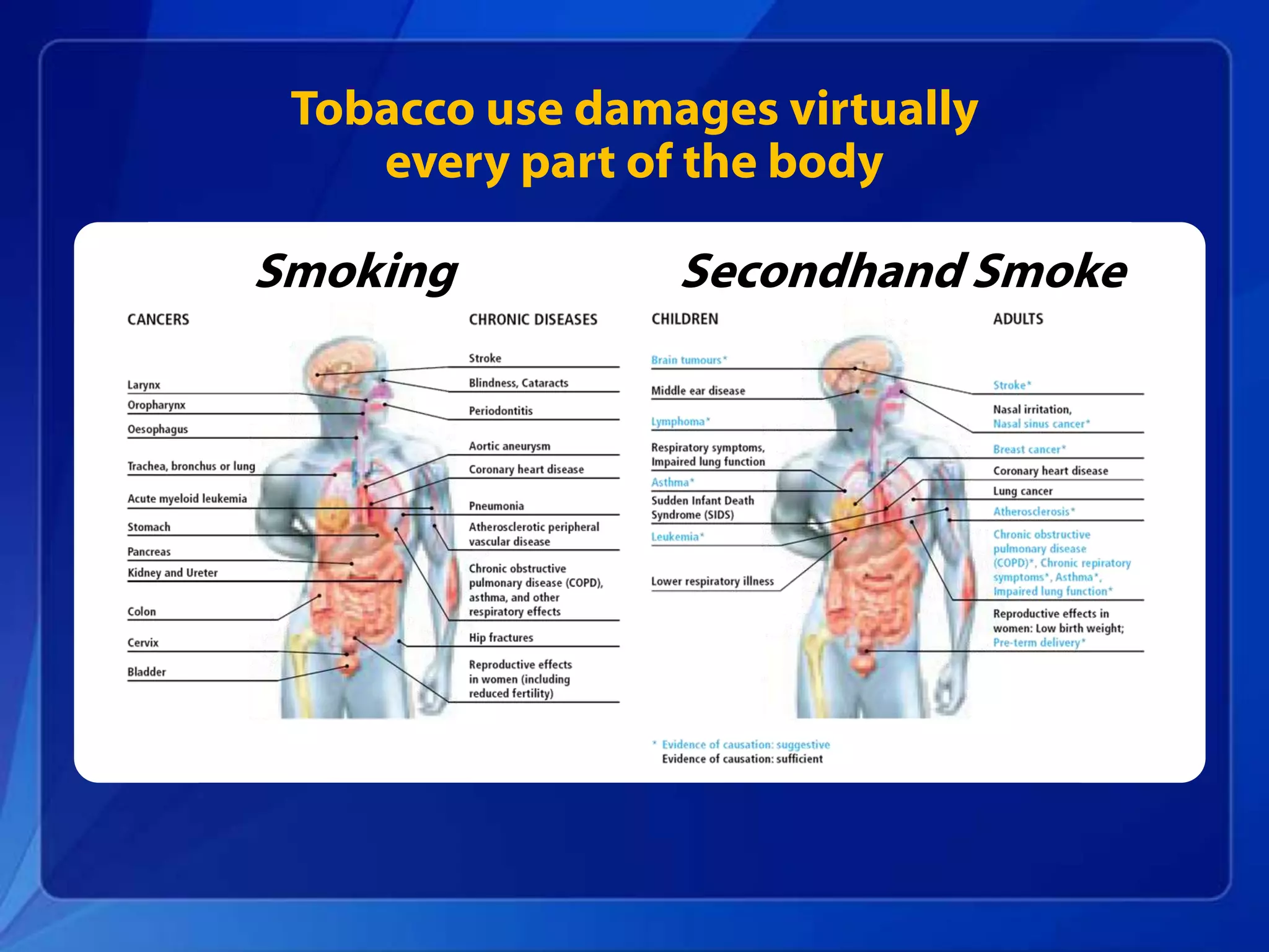 Tobacco use is still the leading preventable cause of death in the U.S., killing over 440,000 Americans each year. While smoking rates have declined, progress has stalled in recent years. Comprehensive tobacco control programs that increase tobacco taxes, implement smoke-free laws, fund anti-smoking media campaigns, and increase access to cessation services have been shown to effectively reduce smoking rates and the health burdens and economic costs of tobacco use. However, more remains to be done as the tobacco industry continues to outspend tobacco control efforts. Sustained funding and expansion of comprehensive tobacco control programs nationwide are needed to continue making progress toward creating a tobacco-free generation.