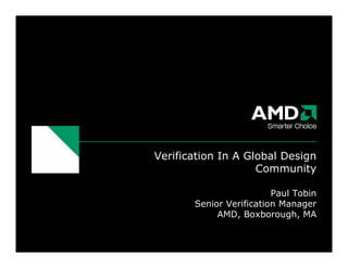 Verification challenges have increased with the globalization of chip design. Time zone differences and documentation issues can reduce efficiency, but greater collaboration across sites can also lead to new ideas. AMD addresses these challenges through a Verification Center of Expertise (COE) that coordinates methodologies across multiple sites. The COE develops tools and techniques while partnering with project teams to jointly improve processes over time through continuous review and rotation of engineers between the COE and projects.