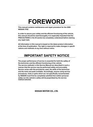 This document provides a quick reference index and specifications for various components of a 2009 Nissan 370Z. It includes charts listing specifications for the engine tune-up, front and rear wheel alignment, brake pedal dimensions, brake component dimensions and wear limits, refill capacities, and more. The index at the beginning provides a listing of general sections and components covered in the service manual, from A for general information to P for maintenance.