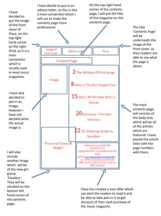 The document discusses the layout and elements of a magazine contents page. It will include article titles and page numbers, an editor's letter, the magazine title at the top, and images of the magazine cover and a music group. The cover image will be in the top right corner following convention, and an offer will be included to alert readers.