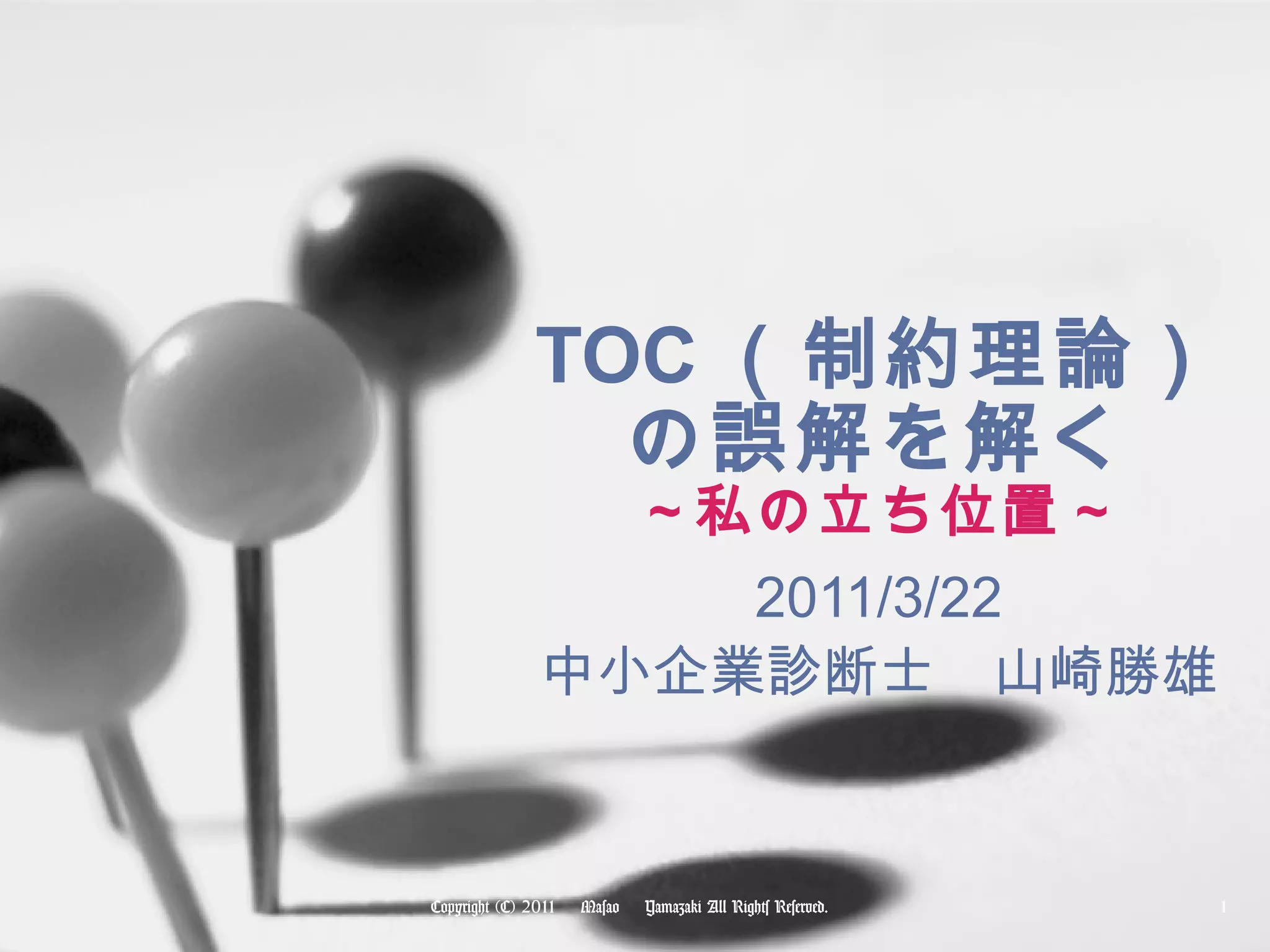 Tocの誤解を解く 1. 2. TOC (制約理論)とは(1) TOC ( theory of constraints : 制約理論)は、イスラエル出身の物理学者エリヤフ・ゴールドラット博士( Dr. Eliyahu M. Goldratt ) が提唱した理論体系である。 ゴールドラットは、友人の工場から生産スケジュールに関する相談を受けた時に理論化が始まったと言われている。 3. TOC (制約理論)の歴史背景 TOC (制約理論)は、2001年に邦訳された「ザ・ゴール ~ 企業の究極の目的とは何か ~ 」という小説風の本により日本に入ってきた。 その本では、下記の工場が舞台となっている。 機械メーカ MRP 的な生産方式 4. 5. 6. TOC の本質(1) TOC の原型は、確かに組み立て工場のプッシュ型で出来上がったものである。 しかしながら、ゴールドラットは物理学者らしく個別のソリューションからより普遍的な考え方への適用を狙っている。 プロジェクト管理への適用 小売業の適用など 7. 私が評価する TOC の考え方(1) シンプルな構造であることである。 制約条件を見つける 制約条件を徹底的に活用する 制約条件以外は制約条件に従属させる 制約条件の強化を検討する 惰性に流されず再度繰り返す 8. 私が評価する TOC の考え方(2) 問題解決の思想である そもそもシンプルであるはずである 好ましくない根本原因は、受け入れることの出来ない対立であり、満足いかない妥協の結果に生じる どこかに双方得する( Win-Win )関係が存在すると考える 部分最適の合計が全体最適にあらず 制約とは物理制約だけでなく、方針制約があり課題の多くは方針制約に支配されている 9. 私が評価する TOC の考え方(3) 問題解決の実践的な方法を含む 人間的な側面を重視した解決策 クリティカルチェーン・プロジェクト管理 S-DBR (シンプルな DBR ) 思考のためのプロセスを持つ スループット会計という会計面での考え方を持ち、財務的指標との関係も議論できる 10. なぜ浸透していないのか コンサルタント側の課題 TOC コンサルタントと呼ばれる方は手法重視 TOC,DBR,CCPM といった横文字の乱発 課題認識から手法を選ぶのではなく、手法が適用できる問題を探す 企業側の課題 会計基準、管理会計などは既存の方法であり、現場改善は別という意識 部分最適な解決策の積み重ね 11. 私のスタンス あくまでも問題解決がゴール TOC だろうが、 IT だろうがあくまでも問題解決の一手法 問題を整理し最適な手法を使うだけ 手法の理解よりも、解決に向かう道筋をご理解いただくことが必要 過去に何回も TOC を使った解決案を提案しているが理論の説明はしていない。今後も不要である。