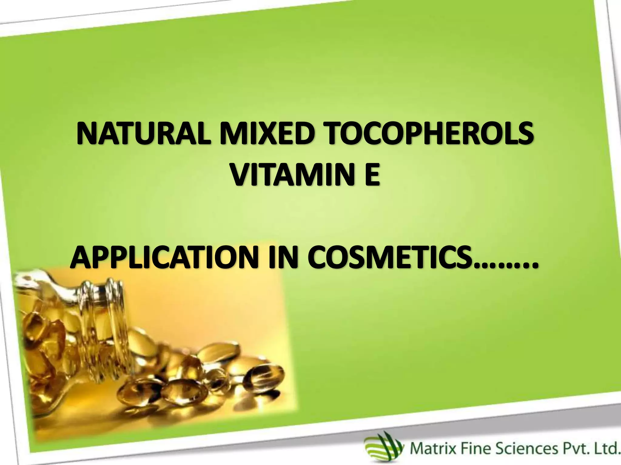 Matrix Fine Sciences Pvt Ltd specializes in manufacturing natural mixed tocopherols, a form of Vitamin E, which provides numerous benefits for skin health and cosmetics, such as antioxidant properties, moisture retention, and protection against photoaging and pollutants. The document highlights the superiority of natural Vitamin E over synthetic variants in terms of efficacy and skin compatibility while emphasizing the company's commitment to natural and environmentally friendly production methods. Additionally, it outlines various applications of Vitamin E in cosmetics and health-related products, underscoring its role as an effective ingredient for skincare and hair care.