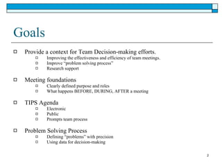 The document summarizes a training manual on establishing effective team processes for problem solving using the Team Initiated Problem Solving (TIPS) model. It emphasizes defining roles for meetings, using electronic meeting minutes, and following a problem-solving process that includes defining problems precisely, using data, developing solutions, and evaluating outcomes. Key aspects of effective meetings highlighted are establishing structure, roles, norms, agenda, and documentation of discussion, decisions, and next steps.
