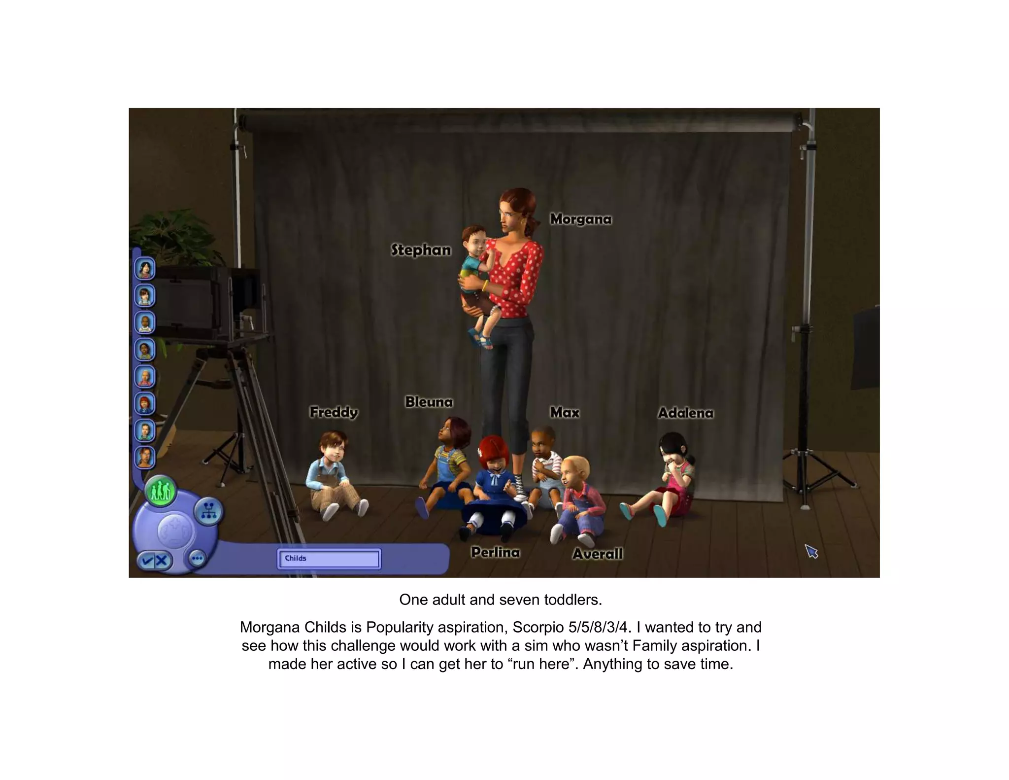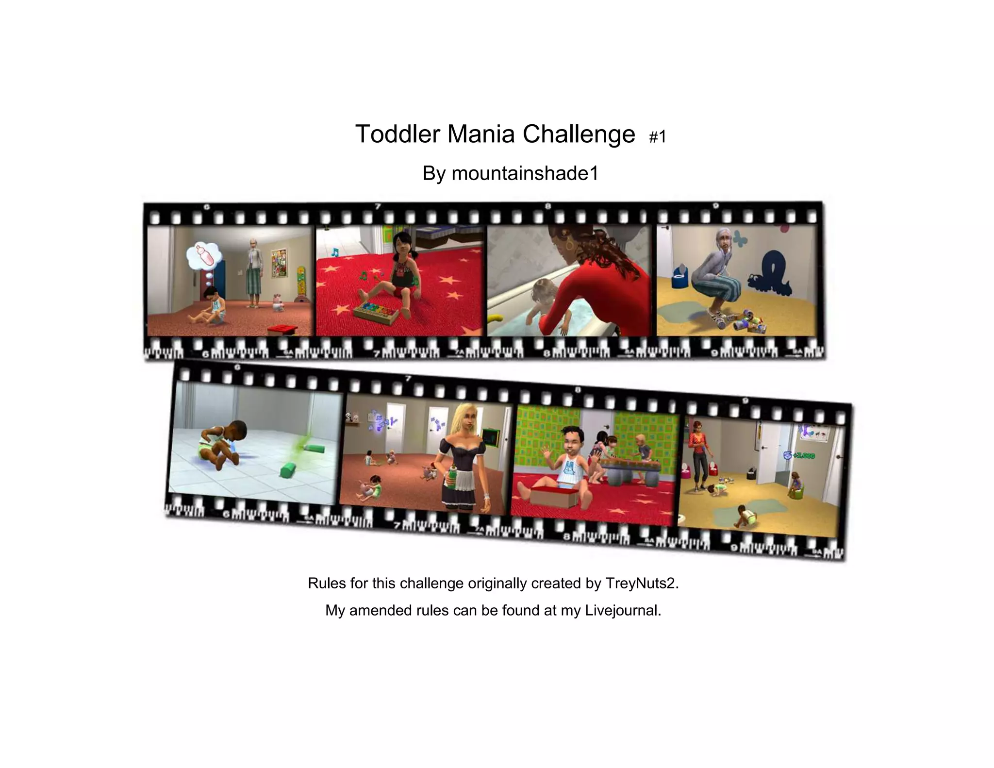 Seven toddlers and their mother Morgana Childs undertake the Toddler Mania Challenge. The document provides details of each toddler and the rules of the challenge. It then summarizes Morgana's experience over several days, including hiring a nanny, potty training the toddlers, dealing with sicknesses and passing outs, and the toddlers eventually growing up. The document concludes by tallying the challenge scores and noting some lessons learned for adjusting the rules in the future.