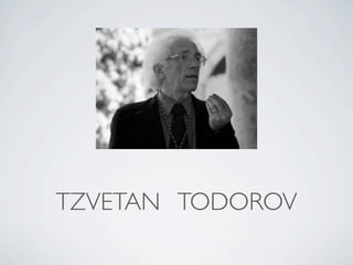 The document summarizes Tzvetan Todorov's narrative theory of the 5 stages of conventional narrative: 1) state of equilibrium, 2) disruption of equilibrium, 3) recognition of disruption, 4) attempt to repair disruption, and 5) reinstatement of equilibrium. It notes this theory is used in many texts like books, films, music videos, and songs. A few examples are provided: the films "A Cinderella Story" and "The Hangover"; the songs "Burn" by Usher, "Irreplaceable" by Beyonce, and "Lay It Down" by Lloyd ft Patti LaBelle; and the music videos for "Take On Me" by A-ha and "