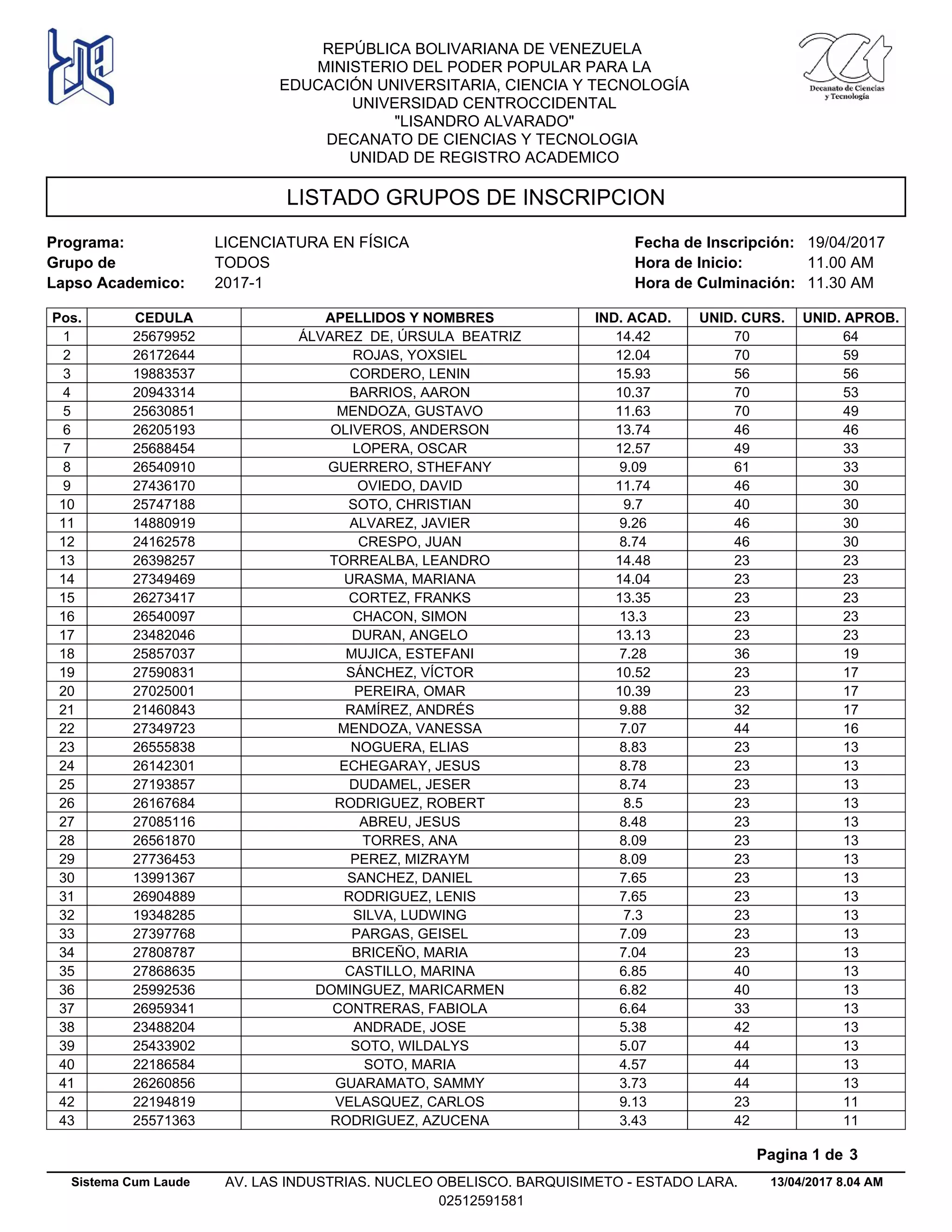 Y NOMBRES IND. ACAD. UNID. CURS. UNID. APROB. 7.4524614926 GRASSY, SETTIMIO 23 1044 6.9128204879 ARAGOZA, GABRIELA 23 1045 6.026568598 GONZALEZ, JOSE 23 1046 4.9126318091 ESPINOZA, YORGELYS 34 1047 8.1727760023 CARBALLO, HELEN 23 948 8.027008256 MARCHAN, JOSE 23 949 7.1325495594 FERNANDEZ, JEISON 32 950 5.1726943179 SUPERLANO, MIGUEL 23 851 5.6527585184 GARCIA, YORDANY 23 752 4.8324353209 PULIDO, ANYELO 23 653 5.0426945098 MUJICA, ROBERTH 23 454 4.4123572923 GONZALEZ, LAURYSBELL 23 455 4.1726750128 PARADA, JUAN 23 256 4.520644928 SILVA, ANDRES 23 057 3.5726357057 WILBER, ALFREDO 23 058 3.4526187773 ALEJOS, ADRIAN 23 059 3.4328114487 CASTILLO, ANTHONY 23 060 3.3927429922 YAITZKIYGUTIERREZ, VASILIOGREGORIO 23 061 2.9519106416 ESCALONA, LLILVER 23 062 2.8316385623 GIMENEZ, DAILY 23 063 2.7725254436 GUARECUCO, JOSE 23 064 2.4327554980 MANGANELLY, JEHONEL 23 065 2.0420561974 CHIRINOS, ROSANGELA 23 066 1.7826502760 AGUERO, ORIANA 23 067 1.7422325582 MENDOZA, YONNY 23 068 1.6525136208 LEON, LEONEL 23 069 1.3927349191 BARRADAS, HANDREE 23 070 1.1327629778 MARIN, DIEGO 23 071 0.9126141365 MENDOZA, HILDE 23 072 0.5926556320 DUQUE, JHONNY 23 073 0.2315229840 GATICA, EDWIN 23 074 0.2317943499 TORRES, RAFAEL 23 075 0.2324385284 ALVARELLOS, ADRIANA 23 076 0.2325143138 ANGULO, CARMEN 23 077 0.2325760981 DELGADO, MARIA 23 078 0.2326577397 CORDERO, MAIKER 23 079 0.1820348477 OTAZO, EDIXON 23 080 0.1820669001 TORRES, EMILY 23 081 0.1821129077 FRANCO, MARIA 23 082 0.1824683943 NAZARETH, ORTEGA 23 083 0.1825139545 PRINCIPAL, ZENAHIR 23 084 0.1826846593 MORILLO, YHOANDERSON 23 085 0.1725833457 MARTINEZ, JOELYS 23 086 0.1726357600 CAMPOS, DOUGLAS 23 087 0.0915107799 RODRIGUEZ, DIOMAR 23 088 0.0920046792 SILVIA, ANRELYS 23 089 0.0920473530 GONZALEZ, MARIA 23 090 0.0927067433 ALEZONES, ANA 23 091 0.0927205722 ARENAS, DIOALID 23 092 0.017342160 RODRIGUEZ, CARLOS 23 093 0.017600014 PERAZA, EDWARD 23 094 0.019780330 MARCHAN, HANNY 0 095 0.020485678 NAVARRO, YSRAEL 23 096 0.021295856 GONZALEZ, KEISMAR 23 097 0.022196379 COLMENARES, FLORMARI 23 098 0.023307027 ALVARADO, NARDELYS 0 099 0.023837087 PAZ, PABLO 23 0100 0.024418269 ALVAREZ, FRAURIMAR 0 0101 0.024567469 FREITEZ, OMAR 23 0102 13/04/2017 8.04 AM Pagina 2 de 3 Sistema Cum Laude AV. LAS INDUSTRIAS. NUCLEO OBELISCO. BARQUISIMETO - ESTADO LARA. 02512591581