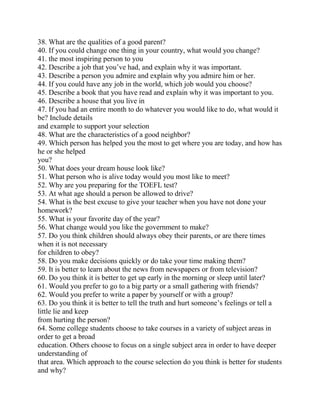 This document provides 75 potential topics for the TOEFL ibt Speaking section. The topics cover a wide range of subjects including personal interests and experiences, opinions on various issues, and descriptions of people, places, objects and events. Some example topics are favorite pet, future plans, favorite subject in school, qualities of a good teacher, preferred mode of transportation, and memorable challenge overcome.