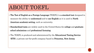 The document is a test preparation guide for the Test of English as a Foreign Language (TOEFL), detailing its design and structure, which measures English proficiency in various academic settings. It discusses the evolution from discrete-point testing to the integrated skills approach of the TOEFL iBT, focusing on reading, listening, speaking, and writing components. Additionally, it provides insights into test strategies, question types, and scoring criteria for each section.