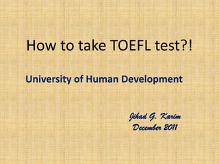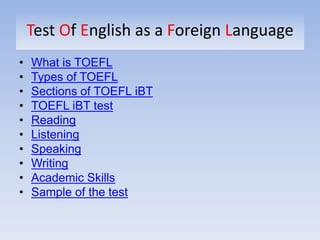 The document provides a comprehensive guide on the TOEFL test, which evaluates the English proficiency of non-native speakers in an academic context. It outlines the different types of TOEFL tests, including the internet-based test (IBT) and its sections: reading, listening, speaking, and writing. Additionally, it details the format and requirements of each section, along with the evaluation criteria for speaking and writing tasks.