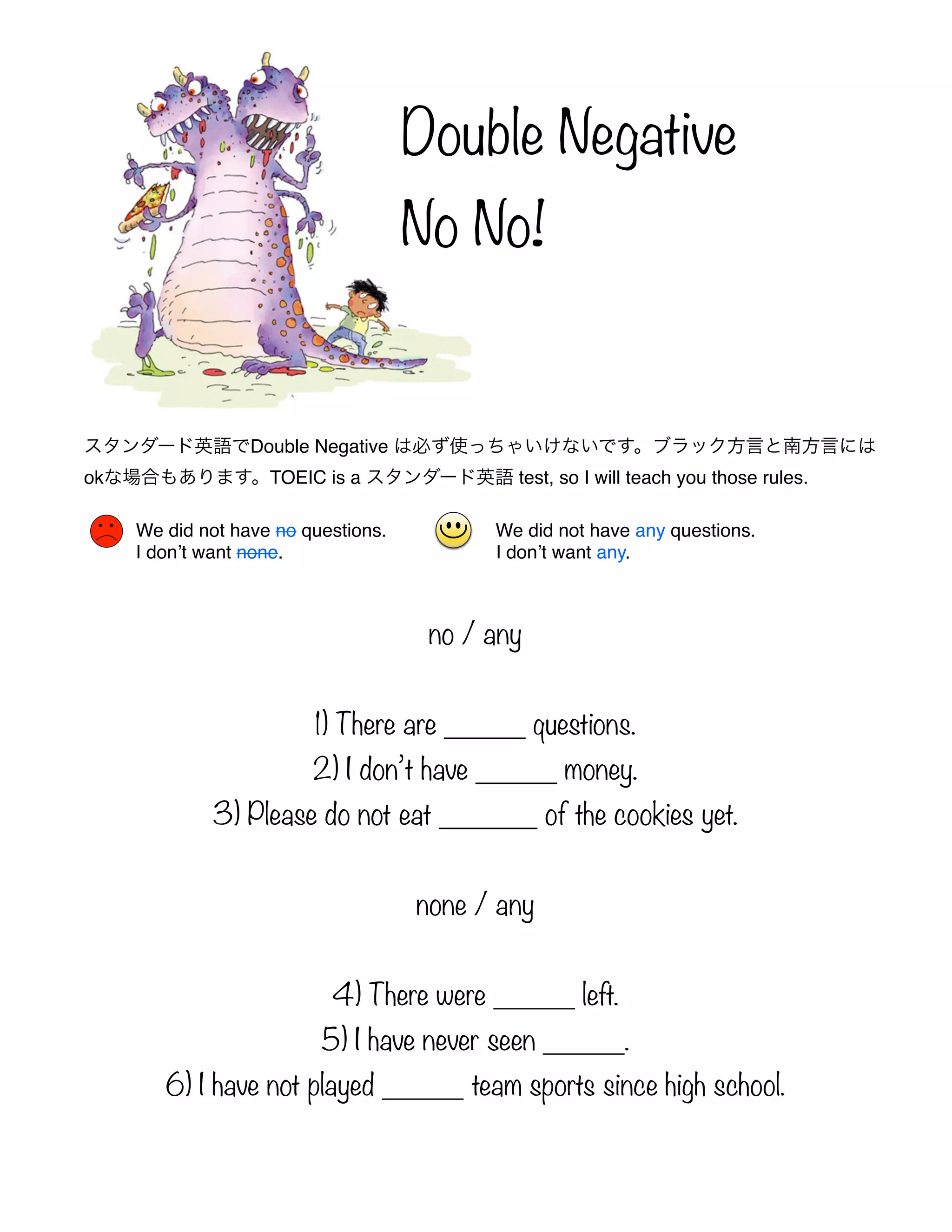 The document discusses the use of double negatives in English and provides examples. It notes that double negatives are not standard in English but are acceptable in some dialects. It then provides examples of sentences with double negatives and their standard English equivalents without double negatives. Finally, it presents examples where "no" should be replaced with "none" and "any".