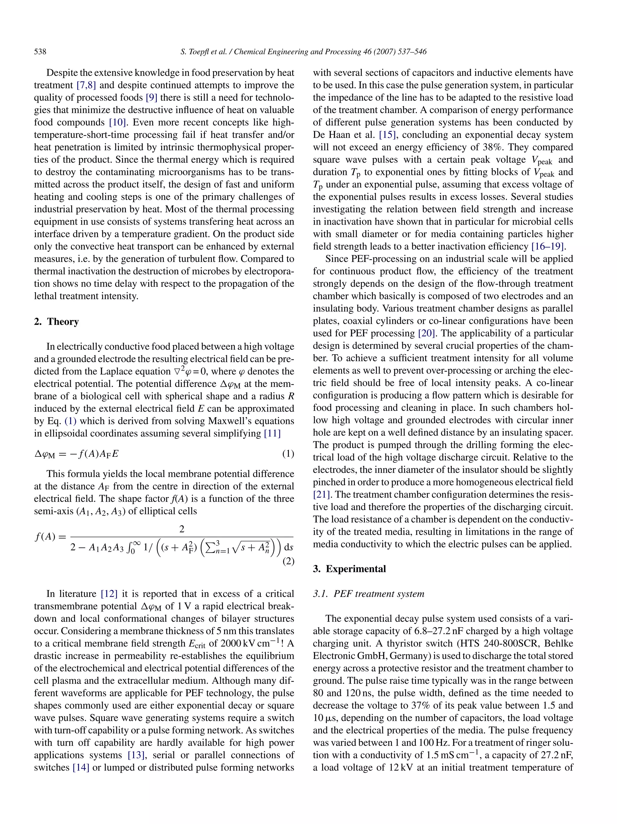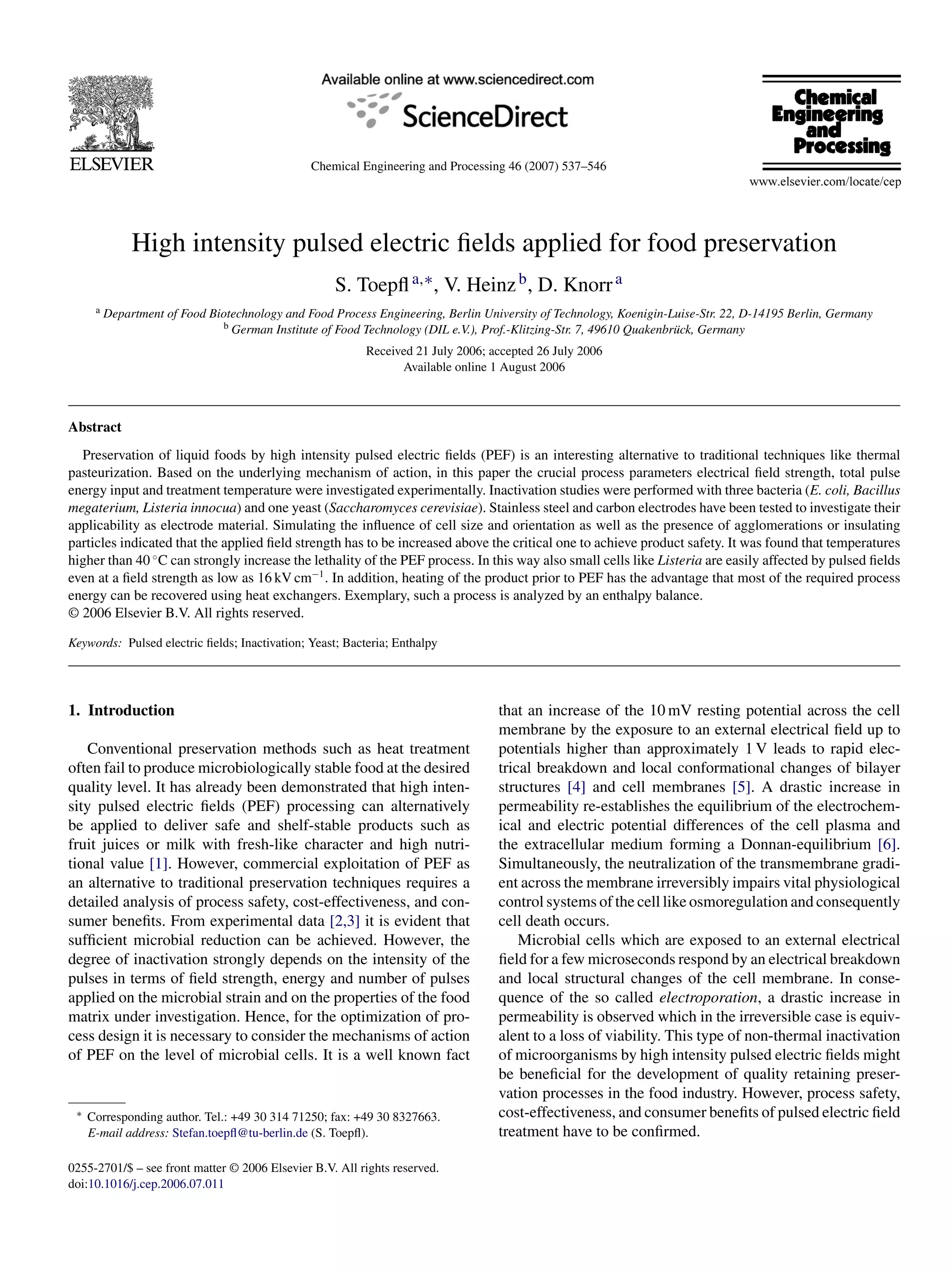 This document summarizes research on using high intensity pulsed electric fields (PEF) to preserve liquid foods as an alternative to thermal pasteurization. It investigates the effects of electrical field strength, total pulse energy input, and treatment temperature on microbial inactivation. Experiments were conducted with bacteria and yeast, and stainless steel and carbon electrodes were tested. The document also discusses theoretical considerations regarding PEF mechanisms of action on microbial cells and outlines design challenges for industrial-scale PEF processing equipment.
