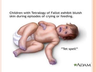 Tetralogy of Fallot is a congenital heart defect characterized by four abnormalities: pulmonary stenosis, ventricular septal defect, right ventricular hypertrophy, and overriding of the aorta. It occurs in approximately 1 in 2,500 live births. Without treatment, it can cause cyanosis and heart failure in infants. The definitive treatment is open-heart surgery to repair the abnormalities. After successful surgery, patients typically enjoy an active life without symptoms.