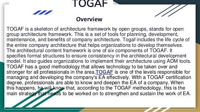 TOGAF, the Open Group Architecture Framework, provides a comprehensive methodology for planning and developing enterprise architecture that aids organizations in aligning technology with their objectives. Certified TOGAF architects simplify the architecture development process and help businesses create effective long-term strategies while ensuring smooth operation and collaboration across departments. The framework emphasizes iterative design and common terminology, making it accessible for organizations to refine their IT infrastructure over time.