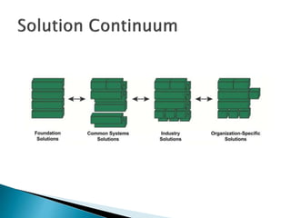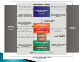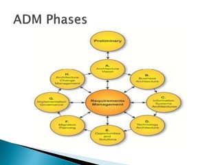 The document provides an overview of the TOGAF (The Open Group Architecture Framework) architecture framework. It discusses the history and development of TOGAF, the key components of TOGAF including the Architecture Development Method (ADM) process, architecture domains, and certification. The ADM is a iterative 8-phase process for developing an enterprise architecture, addressing aspects like business, data, application, and technology architecture. TOGAF provides tools and best practices to help organizations develop, implement, and govern enterprise architectures.