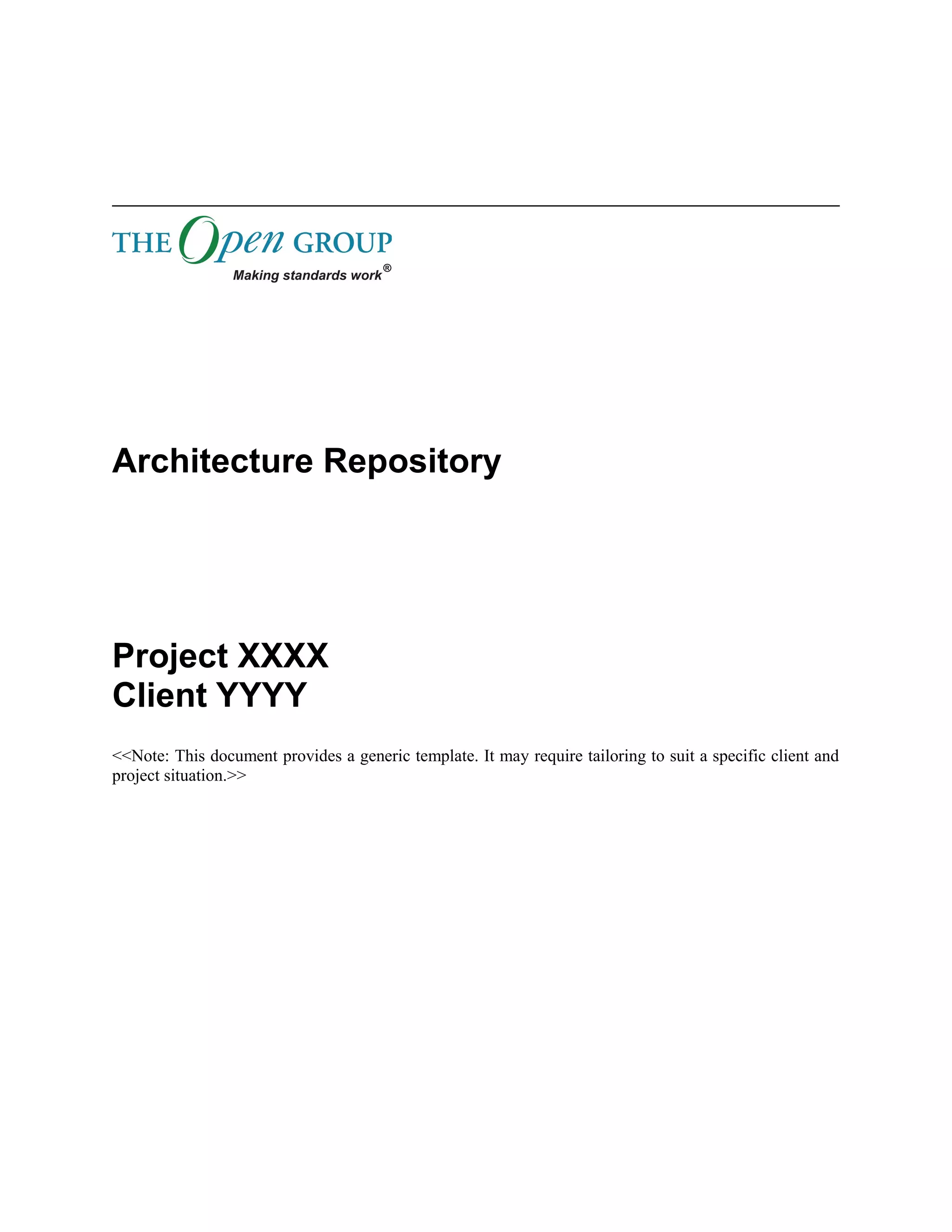 This document provides a template for an architecture repository to store and manage architecture-related projects. The repository contains sections for the architecture framework, standards, architecture landscape, reference architectures, and governance log. It is intended to allow projects to manage deliverables, locate reusable assets, and publish outputs to stakeholders.