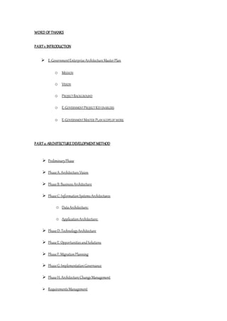This document outlines an enterprise architecture master plan for a government organization. It includes an 8-phase architecture development method to guide the creation of the enterprise architecture. It also establishes several architecture principles for the business, data, application, and technical architectures. Finally, it assesses the organization's current enterprise architecture capability as a Level 3, with the goals of advancing to Level 4 upon completing the architecture development phases and eventually reaching Level 6 with continuous improvements.