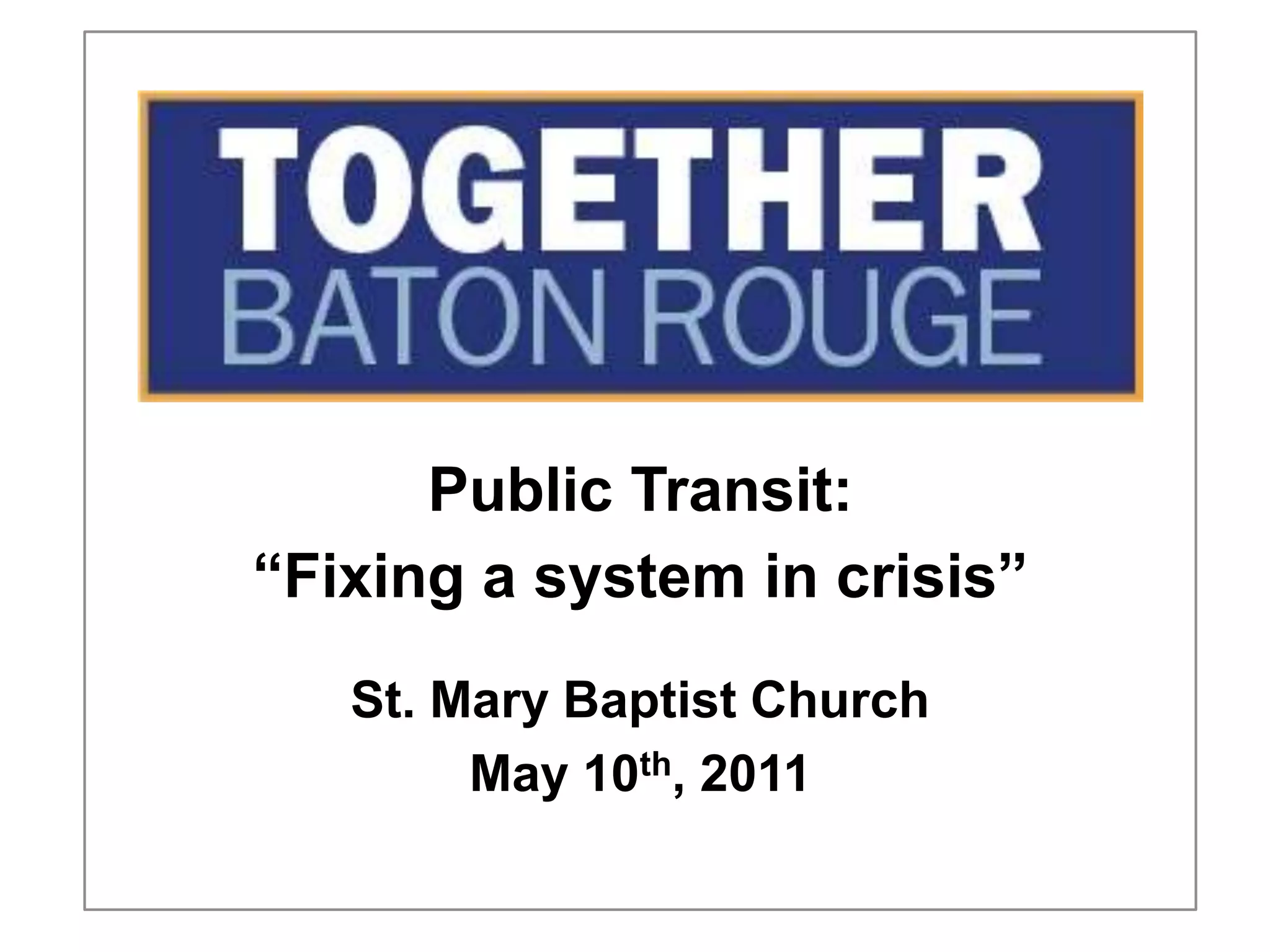 The transit system in Baton Rouge faces serious challenges, as it could run out of funding by October 2011 without additional revenue. It suffers from chronic underfunding compared to peer cities, with a funding level of only $27 per capita compared to $84 on average for peers. The current system is inefficient and unreliable, with long wait times averaging 75 minutes and total travel times of over 2 hours. Four reform proposals are presented: A) Basic reform with decreased wait times and increased routes; B) Increased ridership with faster waits and more routes; C) Broad appeal with highest level of service including BRT and streetcars; or D) No reform and declining service levels without more funding. Proposal C estimates a total budget of