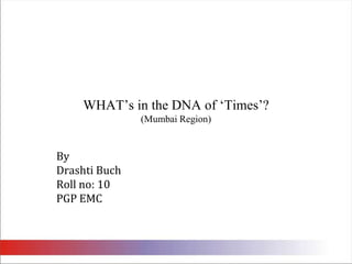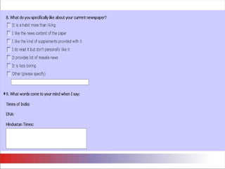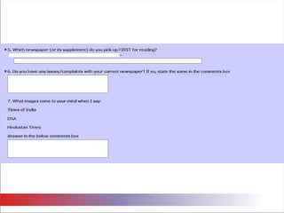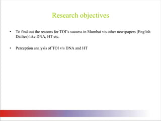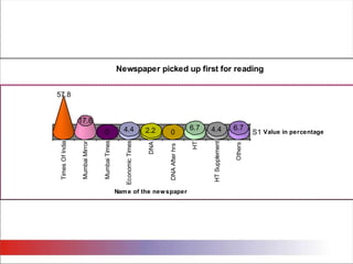 The document summarizes the results of a survey conducted to analyze readership patterns and perceptions of newspapers in Mumbai, specifically The Times of India (TOI), DNA, and Hindustan Times. Some key findings are: