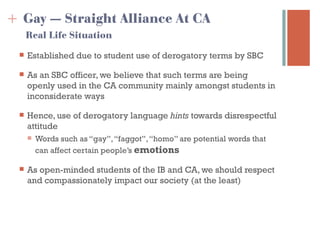 This document discusses how language use can affect emotions both positively and negatively. It notes that derogatory terms like "gay", "faggot", and "homo" are used inconsiderately at the school and can negatively impact people's emotions. Language allows people to make sense of emotions and it can either strengthen knowledge claims by motivating positivity or weaken claims by creating antipathy. The implications of language use go beyond the local situation into literature and ethics. Understanding different perspectives and increasing awareness of impact can help address this knowledge issue.