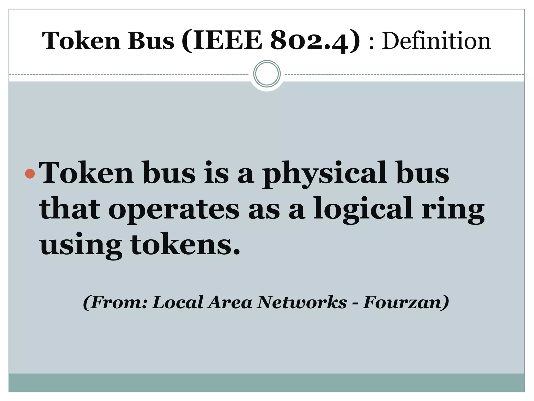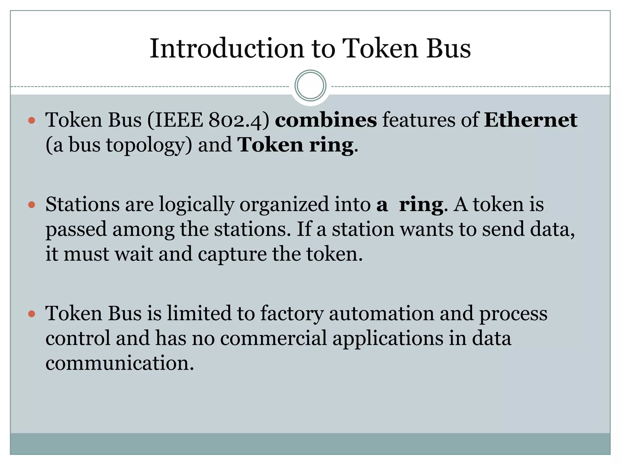 The document discusses Token Bus, which combines features of Ethernet and Token Ring. It operates as a physical bus but with stations logically organized into a ring, passing a token among them. Only the station holding the token can transmit data. Token Bus was limited to industrial applications and saw no commercial use for data communication. It uses the token passing mechanism over a physical bus topology at the data link layer.