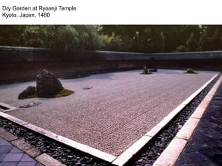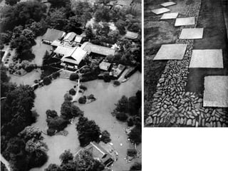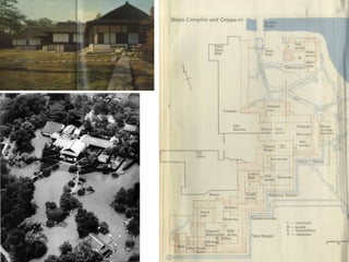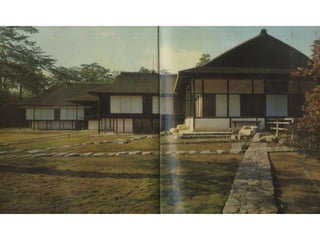 The document contains floor plans and photographs of several historical Japanese gardens and buildings from the 15th-17th centuries, including the Dry Garden at Ryoanji Temple from 1480, the Katsura Imperial Villa complex from 1620-1663, and images of the interiors and exteriors of buildings within the villa like the Old Shoin, Middle Shoin, New Shoin, and two teahouses called Gepparo and Shokintei. The images provide detailed views of the traditional Japanese architectural spaces, gardens, and landscaping within these important historical sites.