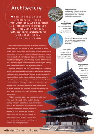 The document provides information about various temples, shrines, and gardens located throughout Japan. It discusses several famous sites in more detail, including Ryoanji Temple known for its dry landscape stone garden, Kinkakuji Temple which features a gold-covered pavilion, and Kamakura's Great Buddha statue. The document also highlights Japanese gardens as refined reproductions of nature that provide a place for relaxation and escape. Nature spots throughout rural Japan featuring rice paddies and villages are also summarized.