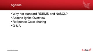 This document summarizes a presentation about using Apache Ignite as a distributed database. It discusses the limitations of standard RDBMS and NoSQL databases, and how Ignite addresses these by providing a consistent and scalable solution. The presentation outlines Ignite's features and architecture, and shares reference cases from companies like ING Group and Ping An Insurance that have benefited from using Ignite. It concludes by providing additional Ignite learning resources and information on downloading a free trial.