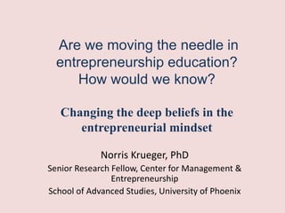 The document discusses the evolution of entrepreneurial education and the importance of fostering an entrepreneurial mindset among learners. It emphasizes the need for transformative learning experiences, defines key issues in measuring and supporting the entrepreneurial mindset, and outlines implications for teaching, public policy, and entrepreneurship itself. The author advocates for a shift from merely learning facts about entrepreneurship to developing a mindset that nurtures entrepreneurial thinking and behaviors.